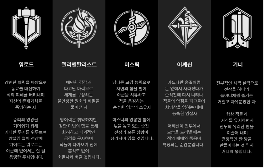 워로드, 엘리멘탈리스트, 미스틱, 어쌔신, 거너 이 5가지 직업으로 나뉜다고 합니다